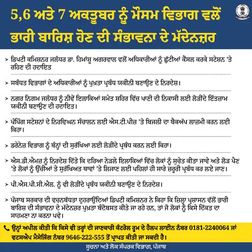 अगले तीन दिनों तक भारी बारिश की संभावना को लेकर जालंधर के डीसी डॉ. हिमांशु अग्रवाल कि तरफ से नए आदेश जारी किए गए हैं। जालंधर के डिप्टी कमिश्नर डॉ. हिमांशु अग्रवाल ने सभी विभागों और एजेंसियों को हाई अलर्ट रहने के निर्देश दिए हैं। साथ ही उन्होंने अधिकारियों की छुट्टियां रद्द कर उन्हें अपने कैंप ऑफिस में तैनात रहने का आदेश दिए हैं।
