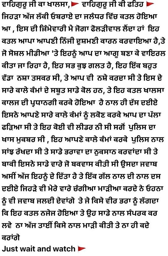 पोस्ट में लिखा है कि कत्ल निजी दुश्मनी के कारण करवाया है। जो सोशल मीडिया पर पोस्ट वायरल हो रहे उसे आप नेता बनाकर वायरल किया जा रहा है, यह सब गलत है। वह नशा तस्कर है और खुद भी नशे करता है। इसके सारे काले धंधों के हमारे पास सबूत है।