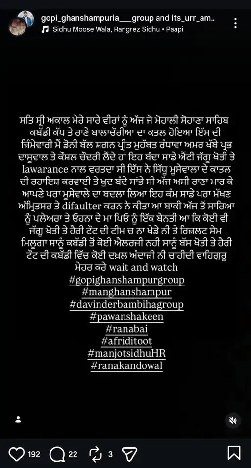 वहीं इस हत्या की जिम्मेदारी बंबीहा गैंग ने ली है। बंबीहा गैंग ने सोशल मीडिया पर पोस्ट शेयर करते हुए लिखा कि राणा को मारकर पंजाबी सिंगर सिद्धू मूसेवाला की हत्या का बदला लिया गया। राणा ने मूसेवाला के कातिलों के ठहरने का इंतजाम किया था। हालांकि वायरल हो रही पोस्ट की हम पुष्टि नहीं करते हैं।