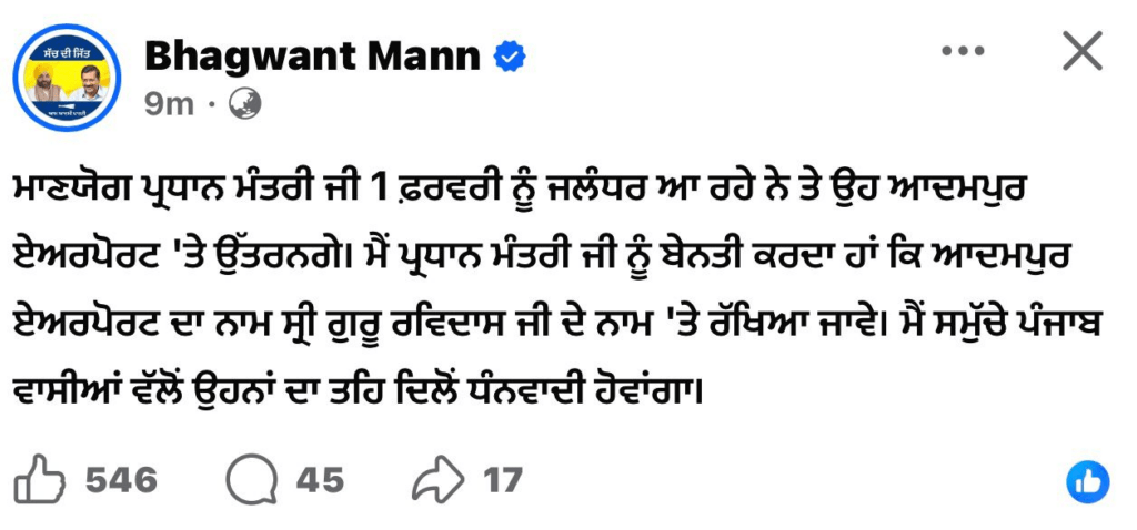 ख़बरिस्तान नेटवर्क : प्रधानमंत्री नरेंद्र मोदी 1 फरवरी को जालंधर के दौरे पर आ रहे हैं। उनके इस दौरे से पहले मुख्यमंत्री भगवंत मान ने उनसे एक मांग की है। उन्होंने सोशल मीडिया पर पोस्ट शेयर कहा कि आदमपुर एयरपोर्ट का नाम श्री गुरु रविदास जी के नाम पर रखा जाए। अगर केंद्र सरकार यह फैसला लेती है तो वह पूरे पंजाब वासियों की तरफ से प्रधानमंत्री के धन्यवादी होंगे।
