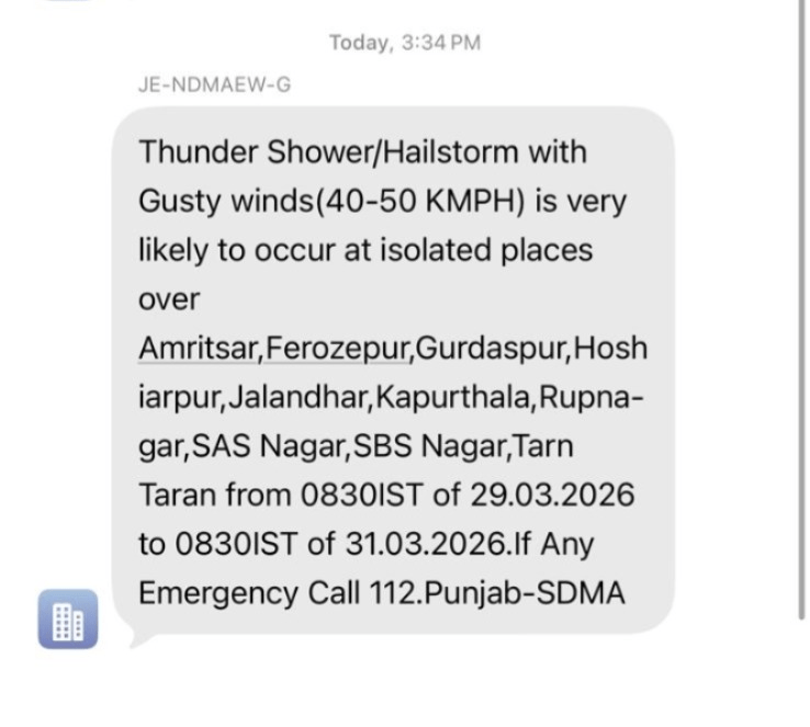 पंजाब में मौसम को लेकर लोगों के मोबाइल फोन पर लगातार अलर्ट मैसेज भेजे जा रहे हैं। Punjab SDMA (स्टेट डिजास्टर मैनेजमेंट अथॉरिटी) की ओर से जारी इन संदेशों में अगले कुछ दिनों तक खराब मौसम की चेतावनी दी गई है।