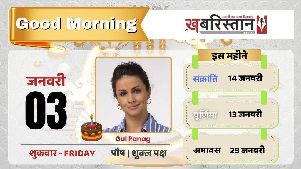 आज 3 जनवरी 2024, कृष्ण पक्ष, सप्तमी तिथि है, आज बुधवार है। अगर कोई शुभ कार्य करना चाहते हैं तो राहुकाल का समय जरूर नोट कर लें, इस समय कोई शुभ कार्य न करें। आज राहुकाल 12:25PM-1:43PM तक रहेगा। नक्षत्रों की बात करें तो आज उत्तरा फाल्गुनी नक्षत्र का योग है।