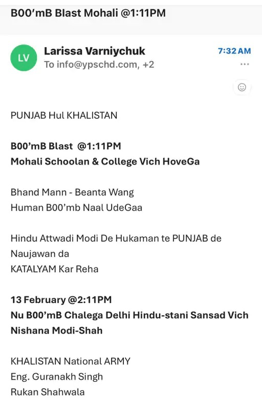 स्कूल को मिली मेल में लिखा है कि दोपहर 1:11 बजे मोहाली में बम ब्लास्ट, मोहाली के स्कूलों और कॉलेजों में बम ब्लास्ट होगा।