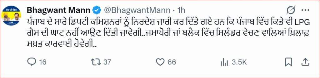 सीएम मान ने सोशल मीडिया पर पोस्ट शेयर करते हुए लिखा कि पंजाब के सभी डिप्टी कमिश्नरों को निर्देश जारी किए गए हैं कि वह पंजाब में कहीं भी LPG गैस की कमी नहीं आने आने दी जाएगी। जमाखोरी या फिर ब्लैक में सिलेंडर बेचने वालों के खिलाफ सख्त कार्रवाई की जाएगी।