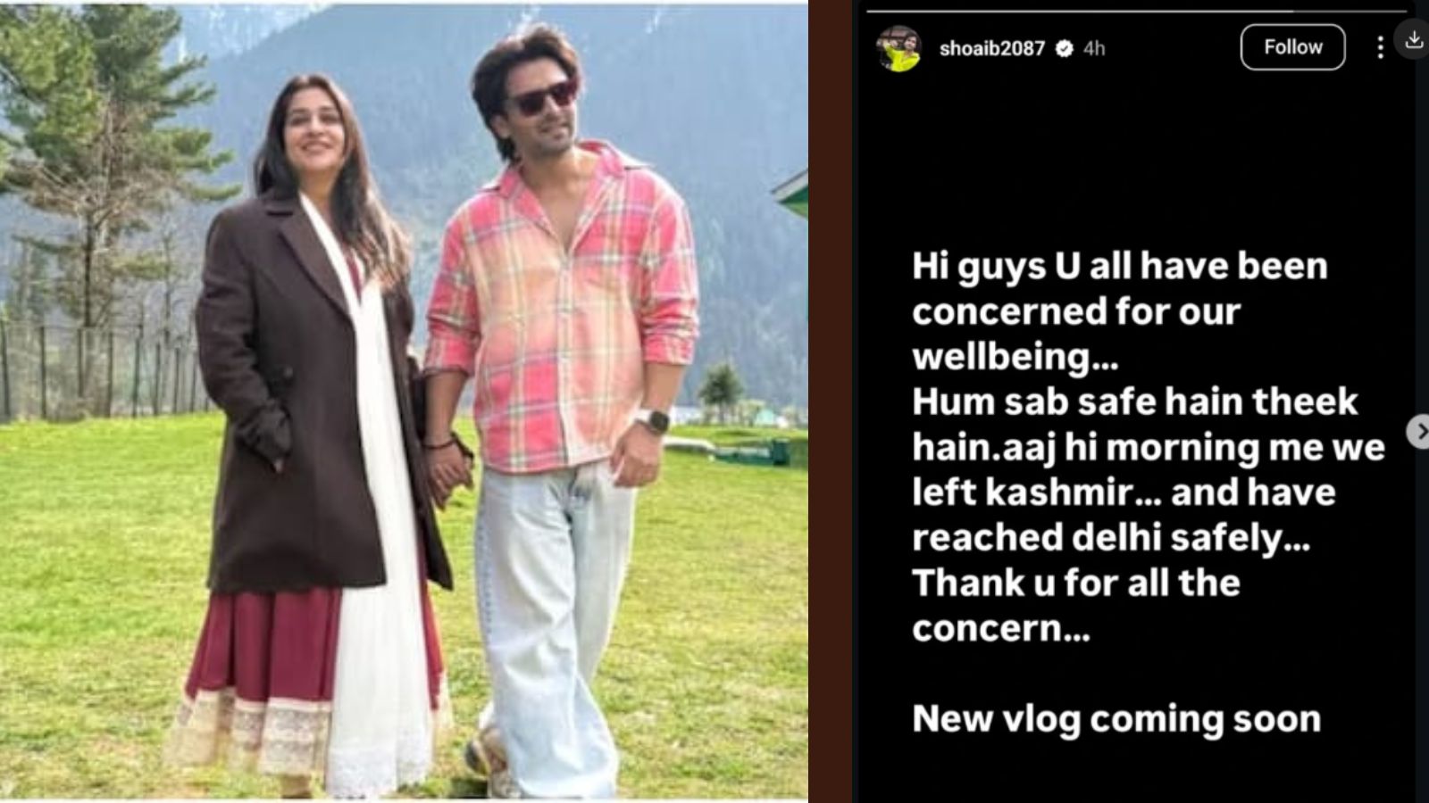 शोएब इब्राहिम ने अपनी सलामती की खबर देते हुए लिखा- हैलो दोस्तों, हम सब ठीक हैं। आज सुबह ही वे कश्मीर से वापिस लौट आए थे। हम सुरक्षित दिल्ली पहुंच चुके हैं। आप सब की फिक्र के लिए शुक्रिया। नया Vlog जल्द आ रहा है।