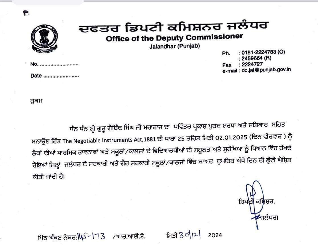 जालंधर  में 2 जनवरी 2025 गुरुवार को जिला प्रशासन की तरफ से आधे दिन की छुट्टी की घोषणा की गई है। श्री गुरु गोबिंद सिंह जी की जयंती को समर्पित गुरुद्वारा दीवान अस्थान सेंट्रल टाउन से निकलने वाले नगर कीर्तन के चलते 2 जनवरी को आधे दिन की छुट्टी की घोषणा की गई ।