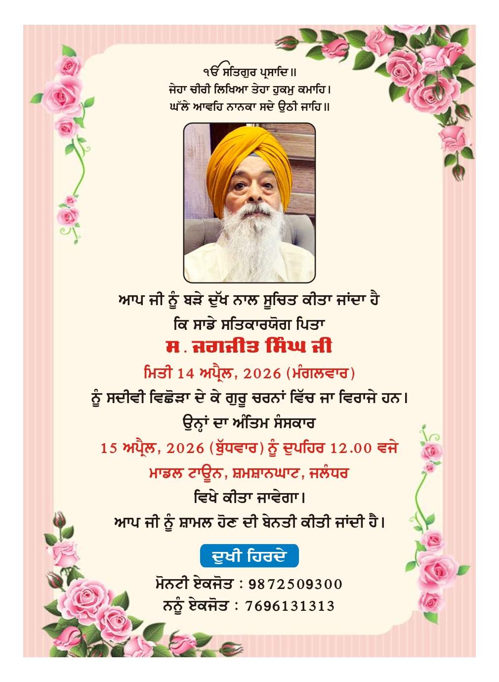 ख़बरिस्तान नेटवर्क : जालंधर से एक दुखद समाचार सामने आया है, जहां स. जगजीत सिंह का मंगलवार, 14 अप्रैल 2026 को निधन हो गया। उन्होंने अपनी सांसारिक यात्रा पूरी कर गुरु चरणों में विलीन हो गए।