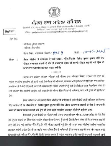 आयोग ने पुलिस प्रशासन को निर्देश दिया है कि कार्रवाई के संबंध में स्टेटस रिपोर्ट प्रस्तुत की जाए। इसके साथ ही, दोनों पक्षों (पीड़ित और एसएचओ) को 13 अक्टूबर को सुबह 11 बजे महिला आयोग के कार्यालय में हाजिर होना सुनिश्चित करने के लिए भी कहा गया है।