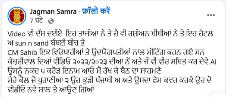 जगमन समरा ने पोस्ट में लिखा कि वीडियो भी ताजी हैं और रशियन महिलाएं भी हैं और होटल सन एंड सैंड बंबई बीच पर सीएम साहब एक व्यापारियों और उद्योगपतियों के साथ मीटिंग करने गए थे।