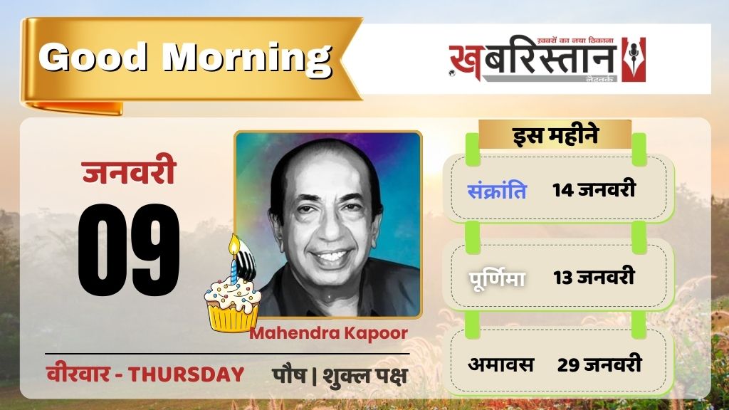 9 जनवरी 2025 को पौष माह के शुक्ल पक्ष की दशमी तिथि है। इस तिथि पर भरणी नक्षत्र और साध्य योग का संयोग रहेगा। दिन के शुभ मुहूर्त की बात करें तो गुरुवार को अभिजीत मुहूर्त 12:07 − 12:48 मिनट तक रहेगा। राहुकाल 13:45 − 15:02 मिनट तक है। चंद्रमा मेष राशि में मौजूद रहेंगे।