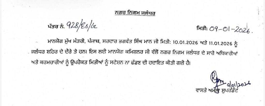 नगर निगम जालंधर के आयुक्त की तरफ से जारी निर्देशों में कहा गया है कि उक्त तिथियों के दौरान नगर निगम के सभी अधिकारी और कर्मचारी स्टेशन नहीं छोड़ेंगे। आदेश में स्पष्ट किया गया है कि मुख्यमंत्री के दौरे के मद्देनज़र प्रशासनिक व्यवस्थाओं को सुचारू बनाए रखने के लिए यह फैसला लिया गया है।