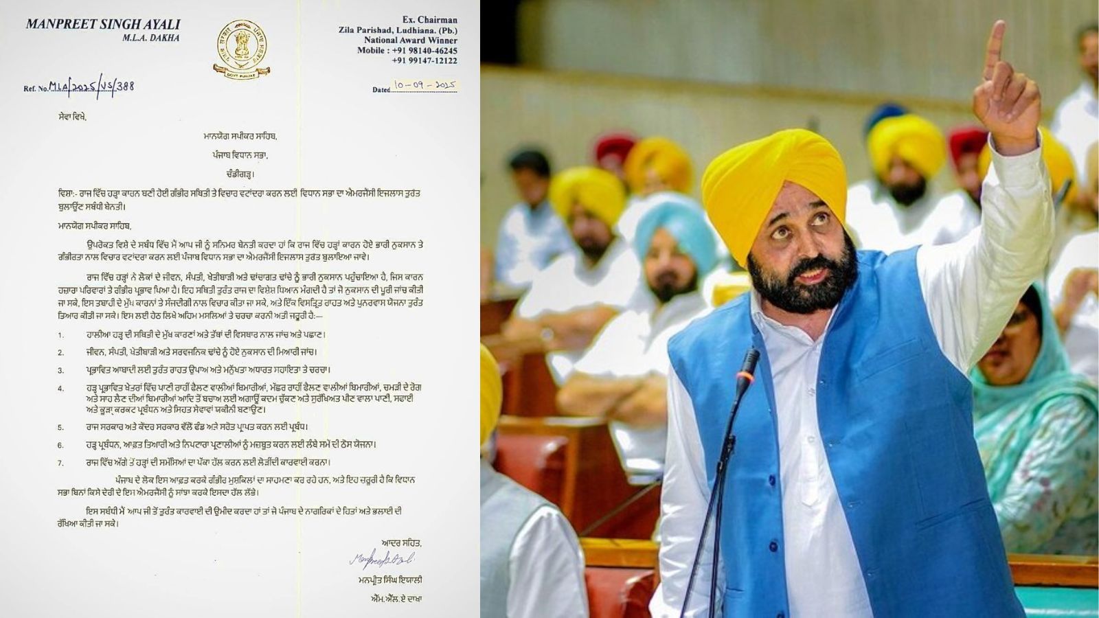 स्पीकर कुलतार संधवा को लिखी चिट्ठी में मनप्रीत अयाली ने लिखा कि पंजाब में बाढ़ के कारण जान-माल और खेती को काफी नुकसान पहुंचा है। इससे हजारों परिवार प्रभावित हुए हैं। यह स्थिति तुरंत विशेष ध्यान की मांग करती है ताकि नुकसान की पूरी तरह से जांच हो सके। गंभीर स्थिति को देखते हुए तुरंत विधानसभा का इमरजैंसी सेशन बुलाया जाना चाहिए।