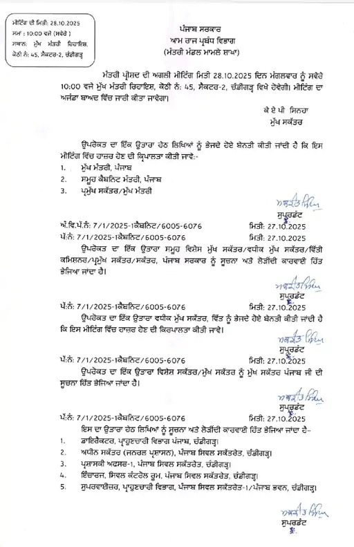 ख़बरिस्तान नेटवर्क : पंजाब सरकार 28 अक्टूबर यानि के कल कैबिनेट की अहम मीटिंग करने जा रही है। यह मीटिंग सीएम आवास चंडीगढ़ में आयोजित की जाएगी। मीटिंग में श्री गुरु तेग बहादुर जी की 350वीं शहीदी शताब्दी समारोह सहित कई महत्वपूर्ण मुद्दों पर फैसला लिया जा सकता है।