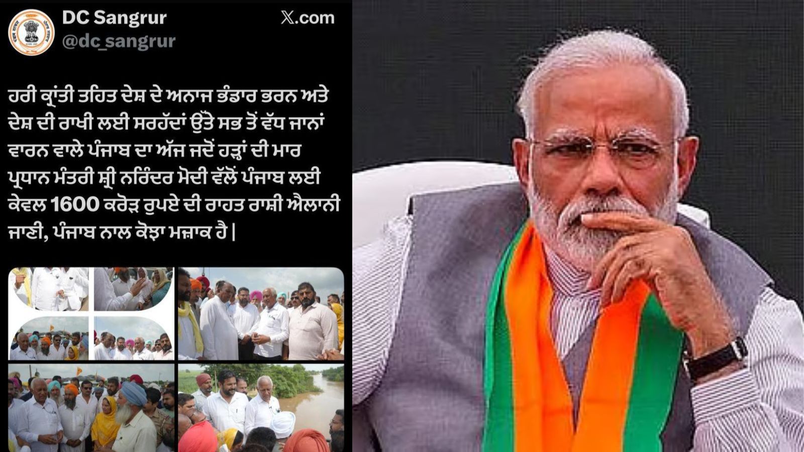 संगरूर के डीसी ने अपने आधिकारिक ट्विटर अकाउंट पर लिखा कि ‘हरित क्रांति के तहत देश के अन्न भंडार भरने और सीमा पर सबसे अधिक शहादत देने वाला पंजाब जब बाढ़ की मार झेल रहा है तो पीएम मोदी की तरफ से मात्र 1600 करोड़ रुपए की राहत राशि की घोषणा करना पंजाब के साथ बहुत बड़ा मजाक है।