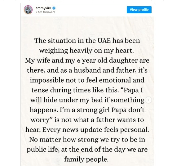 एमी ने बताया कि उनकी पत्नी और उनकी 6 साल की छोटी बेटी इस समय यूएई में हैं, जहां स्थिति काफी गंभीर बनी हुई है। एक पिता और पति के रूप में अपनी बेबसी जाहिर करते हुए एमी ने लिखा कि इस समय शांत रह पाना उनके लिए नामुमकिन है।