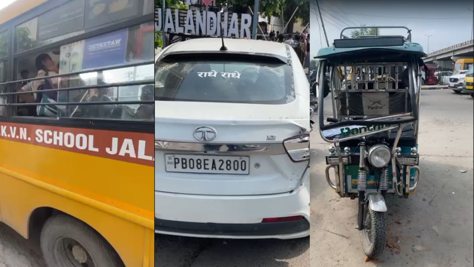 ख़बरिस्तान नेटवर्क : जालंधर में पठानकोट चौक के पास बच्चों से भरी S.K.V.N School Bus बस ने 2 गाड़ियों को टक्कर मार दी। जिस कारण मौके पर काफी ज्यादा हंगामा हुआ है। इस हादसे में ई-रिक्शा चालक जख्मी हो गया। तो वहीं कार को भी काफी नुकसान पहुंचा है। पर गनीमत रही कि इस हादसे में किसी को ज्यादा चोटें नहीं आई।