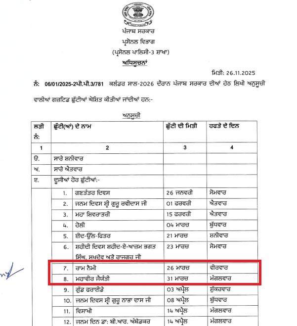 ख़बरिस्तान नेटवर्क : पंजाब में कल सभी स्कूल-कॉलेज और सरकारी ऑफिस बंद रहेंगे। क्योंकि सरकार की तरफ से छुट्टी का ऐलान किया गया है। यह छुट्टी भगवान श्रीराम नवमी के त्योहार को लेकर की गई है।