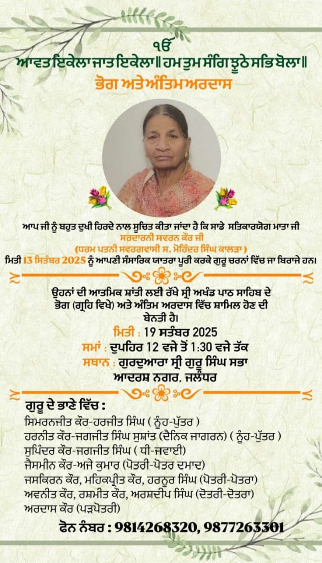 ख़बरिस्तान नेटवर्क : जालंधर के वरिष्ठ पत्रकार जगजीत सिंह सुशांत की माता सवरन कौर 13 सितंबर को अपनी सांसरिक यात्रा पूरी करके गुरु के चरणों में बिराज गई हैं। उनकी आत्मिक शांति के लिए श्री अखंड साहिब का भोग व अंतिम अरदास 19 सितंबर को गुरुद्वारा श्री सिंह सभा आदर्श नगर में दोपहर 12 बजे से लेकर डेढ़ बजे तक है। इस दुःख की घड़ी में परिवार जन, मित्र और शुभचिंतक एक जुट होकर माता जी को श्रद्धांजलि अर्पित करेंगे। ईश्वर माता जी की आत्मा को शांति प्रदान करें।