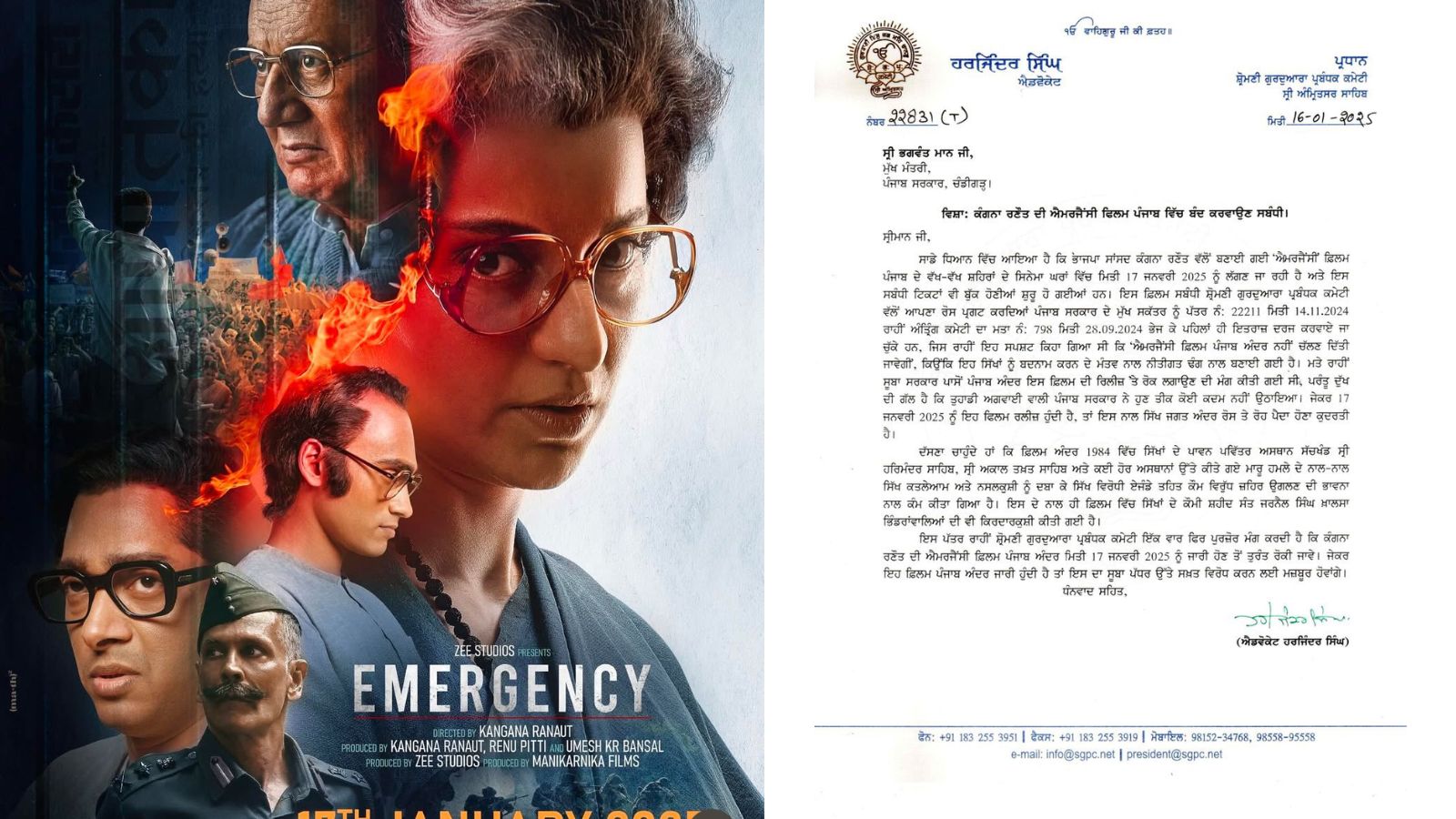 शिरोमणि गुरुद्वारा प्रबंधक कमेटी ने कंगना रनौत की इमरजैंसी फिल्म पर पंजाब में बैन लगाने की मांग की है। SGPC अध्यक्ष हरजिंदर सिंह धामी ने इसे लेकर पंजाब के मुख्यमंत्री भगवंत मान को लैटर लिखा है। उन्होंने कहा कि फिल्म सिख इतिहास को गलत तरीके से पेश करती है और इससे लोगों में आक्रोश फैल सकता है।