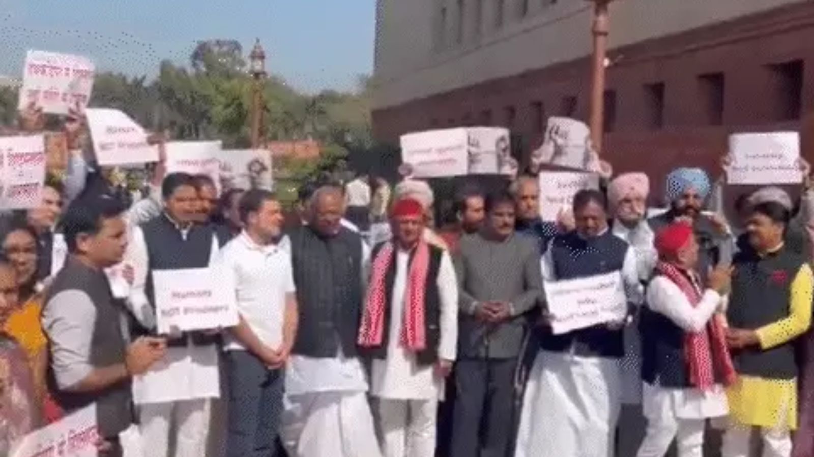 इसके बाद विपक्षी सांसदों ने हथकड़ी पहनकर संसद भवन के बाहर प्रदर्शन किया। इस दौरान कांग्रेसी नेता वेणुगोपाल हाथों में हथकड़ी पहने हुए दिखें। वहीं प्रदर्शन में राहुल गांधी, मल्लिकार्जुन खड़गे, शशि थरूर समेत कई विपक्षी सांसद शामिल हुए।