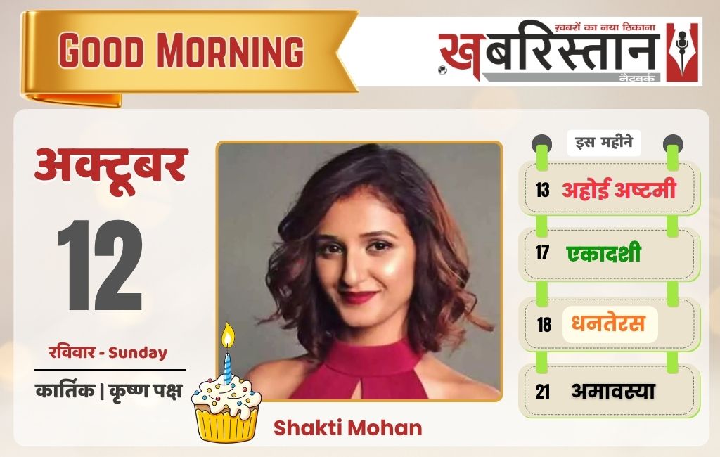 12 अक्तूबर 2025 को कार्तिक माह के कृष्ण पक्ष की षष्ठी तिथि है। इस तिथि पर म्रृगशीर्षा नक्षत्र और वरीघा योग का संयोग बन रहा है। दिन के शुभ मुहूर्त की बात करें तो रविवार को अभिजीत मुहूर्त 11:41 − 12:26 मिनट तक रहेगा। राहुकाल सुबह 09:11 − 10:38 मिनट तक रहेगा। चंद्रमा मिथुन राशि में संचरण करेंगे।