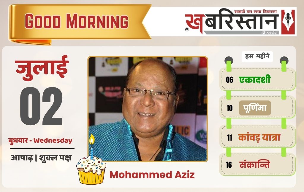 02 जुलाई को आषाढ़ शुक्ल पक्ष की सप्तमी तिथि बुधवार का दिन है। सप्तमी तिथि दोपहर 11 बजकर 59 मिनट तक रहेगी। उसके बाद अष्टमी तिथि लग जायेगी। शाम 5 बजकर 47 मिनट तक वरीयान योग रहेगा।